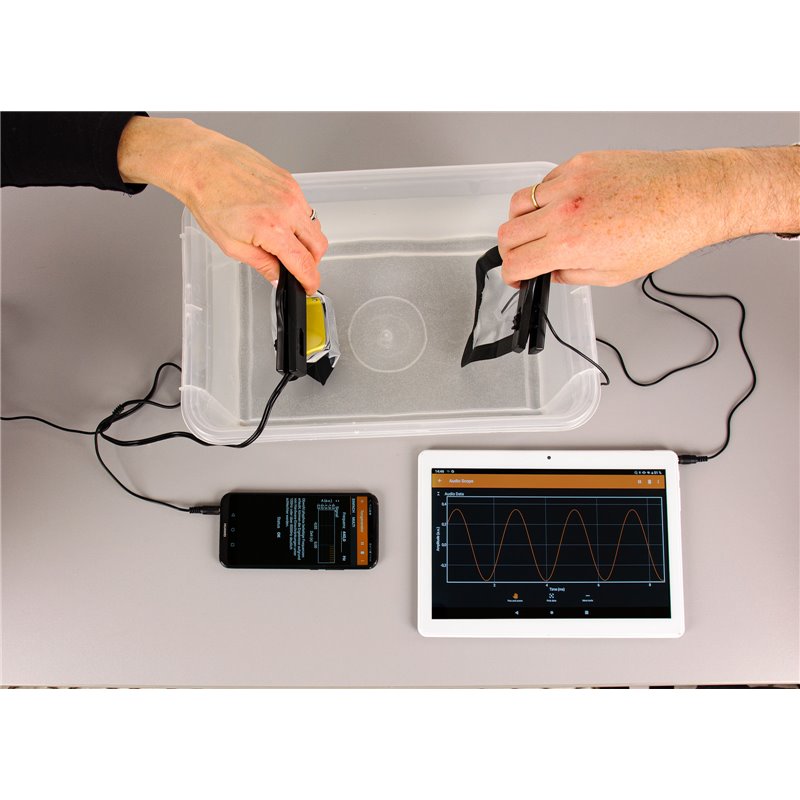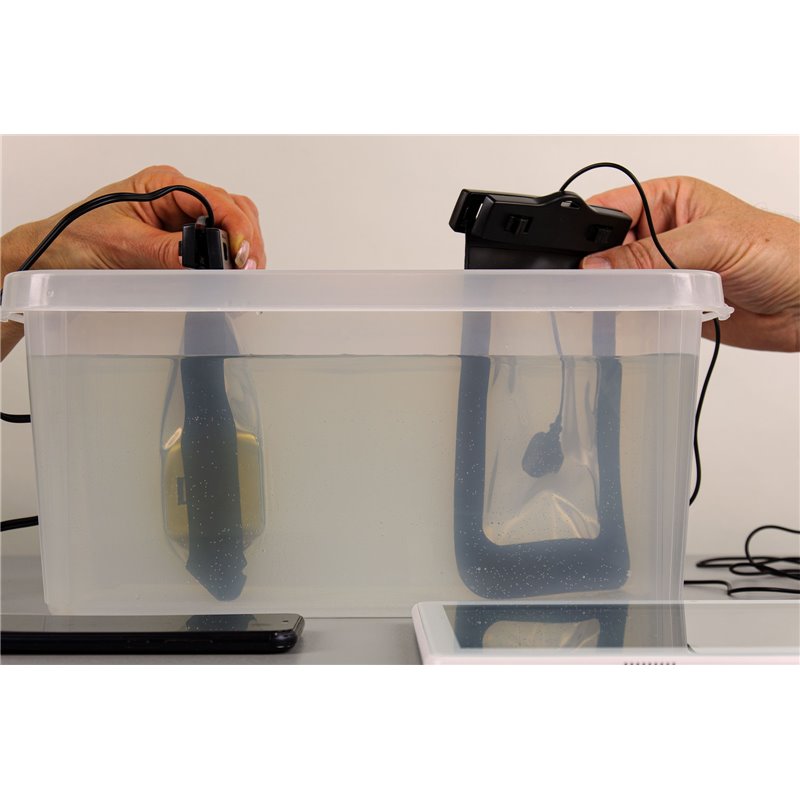 Wasserdichte Hülle für Kleingeräte wie Telefon, Lautsprecher oder Mikrofon, zur Demonstration der Schallausbreitung in Flüssigkeiten sowie des Doppler Effektes; Hülle aus sehr transparentem und hochflexiblem Kunststoff, luftgefüllte Ränder als zusätzlicher Stoßschutz, Beutel durch zwei Hebel einfach, rasch und sicher zu verschließen und zu öffnen, abnehmbares UmhängebandVerfügbarer Innenraum: 70x150 mmAbmessungen: ca. 220x115x15 mmMasse: ca. 51 g