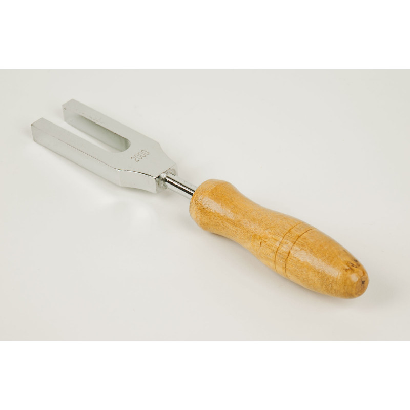 Stimmgabel aus Stahl verchromt, Frequenz aufgedruckt, mit Holzgriff