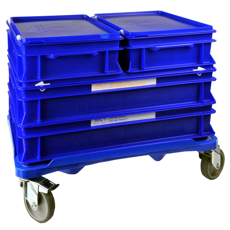 Aufbewahrungs- und Transportwagen für bis zu 12 große oder 24 kleine NTL Aufbewahrungsboxen - eine absolut preiswerte Lösung; Rollwagen aus Kunststoff (ABS) mit 4 Lenkrollen (D = 100 mm), eine davon mit FeststellbremseNutzlast: max. 200 kgAbmessungen: 615 x 415 x 165 mmMasse: ca. 3 kg