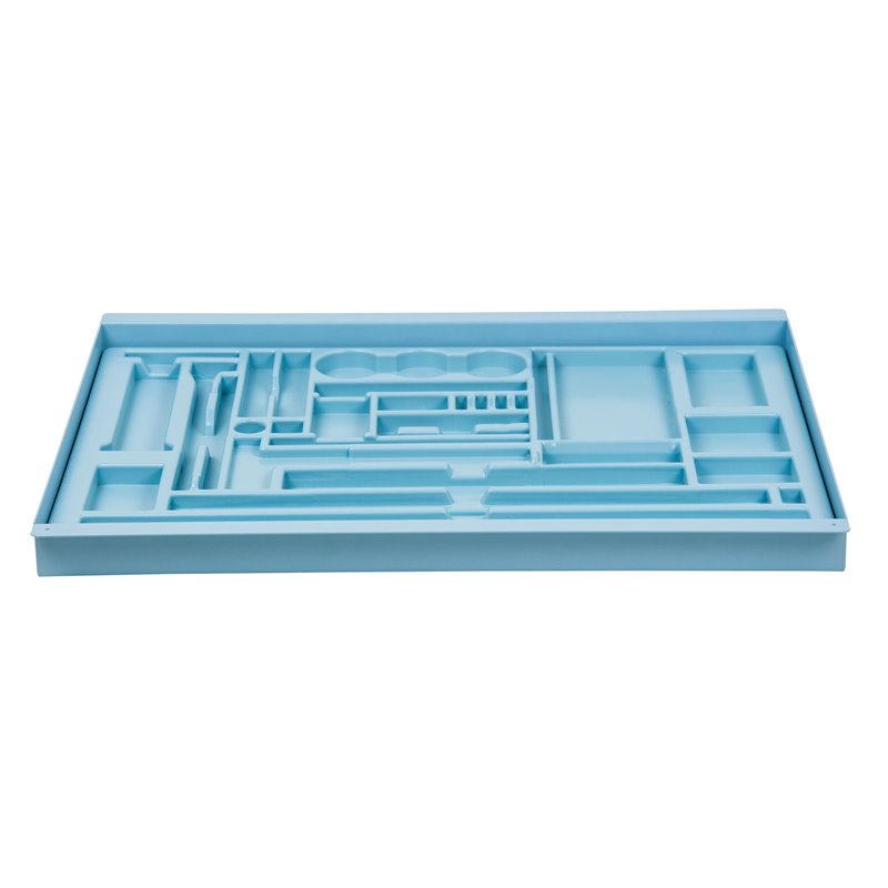 Zur stabilen Aufbewahrung und zum Transport von NTL – Gerätesets mit tiefgezogenen, gerätegeformten Facheinsätzen, in Kästen; Aufbewahrungs-Tablett für Boxeneinsätze groß, mit Trageleisten, ohne DeckelMaterial: robustes Stahlblech, pulverbeschichtet hellblauAbmessungen innen: 556 x 355 x 38 mmAbmessungen außen: 560 x 400 x 40 mmMasse: ca. 3000 g