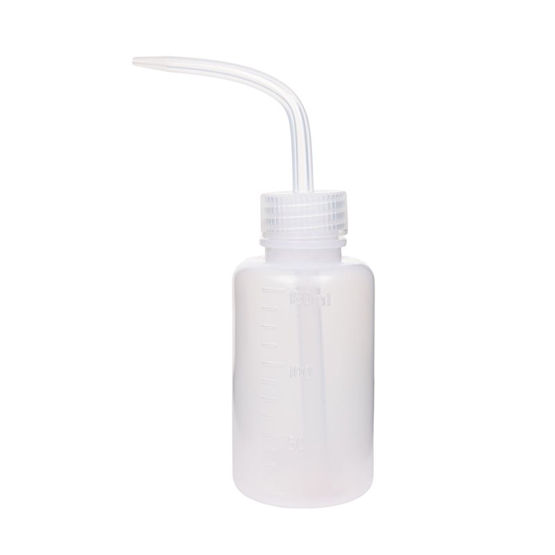 Graduierte Spritzflasche aus Polyethylen, Schraubkappe mit Ansaug- und SpritzrohrFüllvolumen: 150 mlAbmessungen: D=52 mm, H=110 mm (160 mm mit Spritzrohr)Masse: ca. 21 g