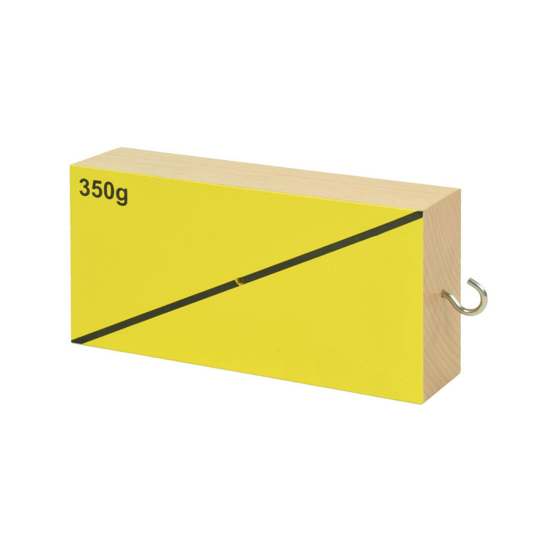Lackierter Holzklotz mit Haken, an der Stirnseite ein Haken zum Einhängen eines Kraftmessers,