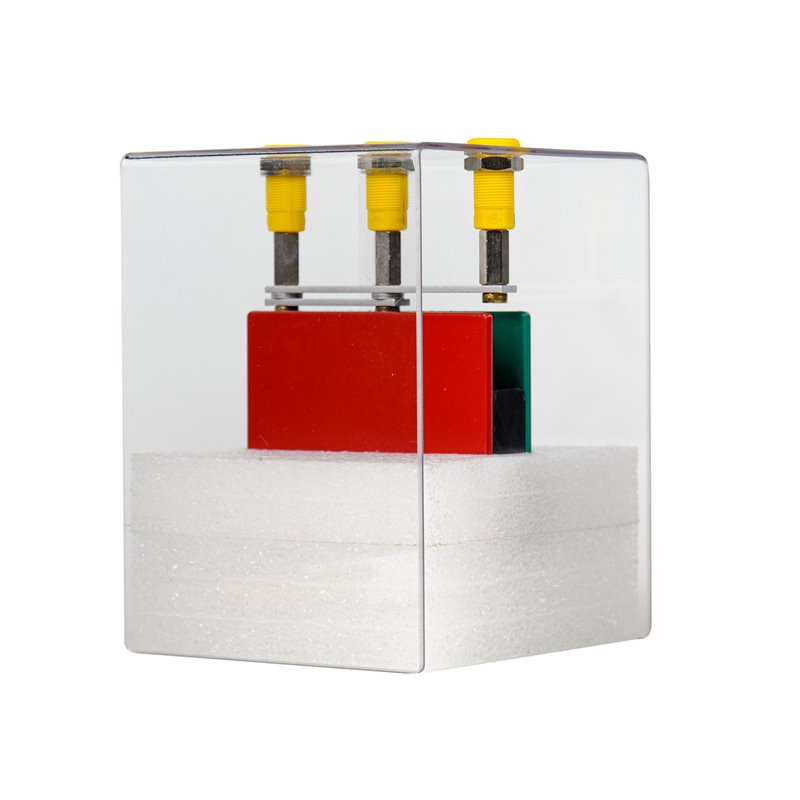 starker Blockmagnet (80x40x15 mm) mit zwei Polblechen zur Erzeugung eines homogenen Magnetfeldes, eingebettet in eine Hartschaumstoffplatte