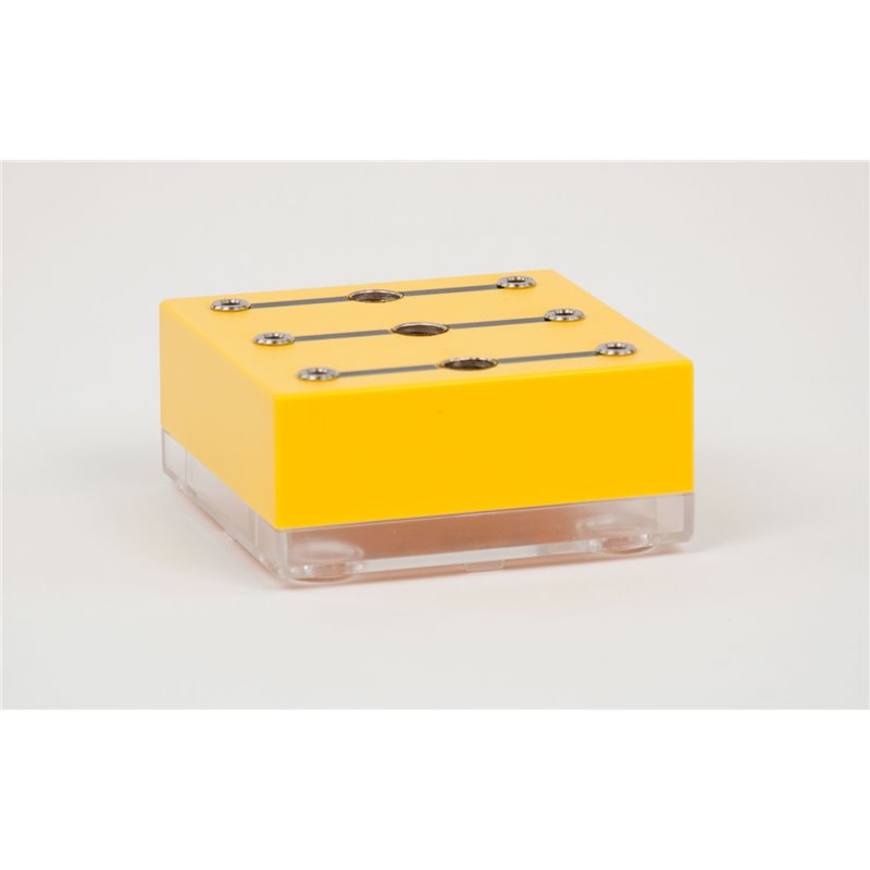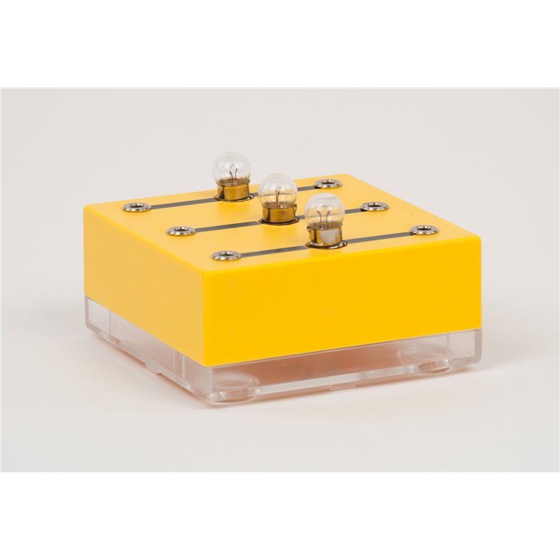 Baustein compact - System (BC), Baustein mit drei Lampenfassungen E10 mit drei 4-mm Buchsenpaaren, zur raschen und einfachen Demonstration einer Serien- oder Parallelschaltung von bis zu drei Glühlampen; robustes Kunststoffgehäuse (ABS) mit transparenter Bodenplatte, der Bauteil ist daher gut sichtbar, jedoch ebenso vor mechanischen Schäden geschützt Schaltsymbole aufgedruckt (Siebdruck) Buchsen auch für 4-mm Sicherheitsstecker geeignetBodenplatte abnehmbarFassung der Lampe: E10Abmessungen: 84 x 84 x 39 mmMasse: ca. 125 g
