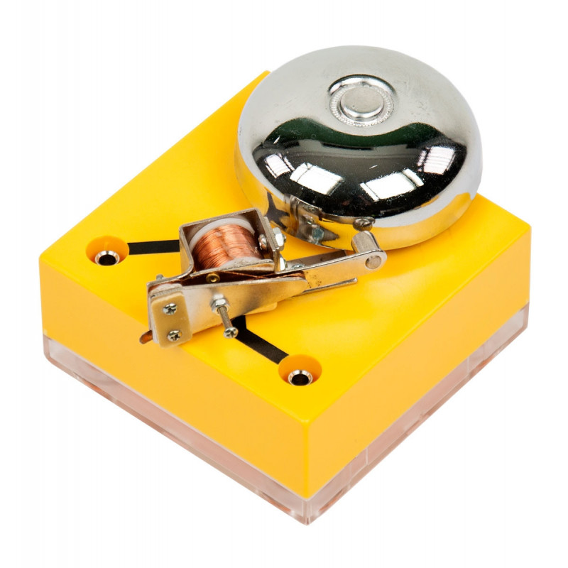 Für Versuche zum Elektromagnetismus, zeigt die Arbeitsweise einer elektrischen Klingel; Magnetbaustein compact - System (MBC), Baustein mit kompletter Klingel in offener Bauweise; robustes Kunststoffgehäuse (ABS) mit transparenter Bodenplatte Schaltsymbol aufgedruckt (Siebdruck) zwei Buchsen, auch für 4-mm Sicherheitsstecker geeignetBodenplatte abnehmbar, mit inliegenden Neodymium MagnetenDurchmesser der Klingelschale: 59 mm Betriebsspannung: 2,7 ... 6 VAbmessungen: 84 x 104 x 66 mmMasse: 154 g