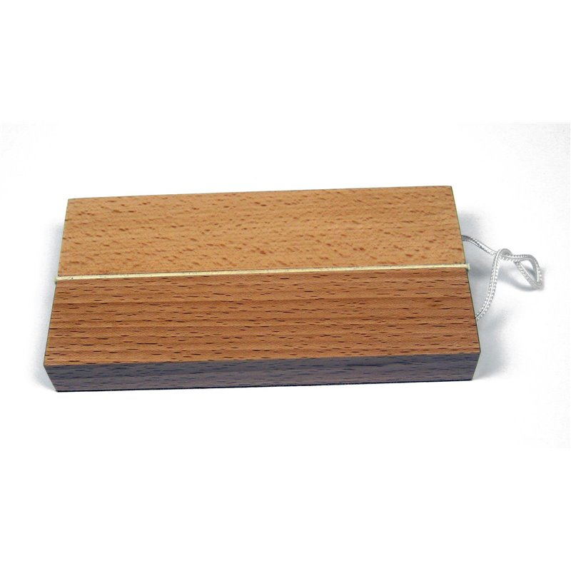 Holzklotz mit vier verschiedenen Oberflächen: Holz, Gummi, Leder und Schleifpapier, eine Stirnseite mit Zugschnur