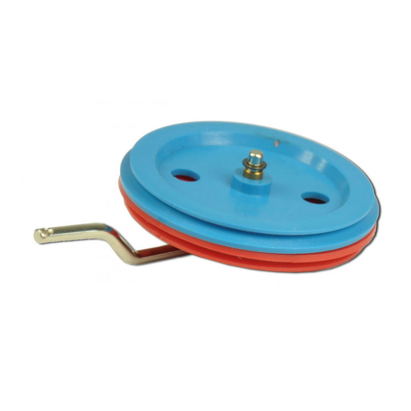Für Versuche zum zusammengesetzten oder doppelten Flaschenzug, für den Bereich der "einfachen Maschinen"; zwei Rollen mit tiefer Schnurrille (was einen guten Halt der Schnur bedingt), jeweils mit zentraler Bohrung mit Messinghülse zur reibungsarmen, drehbaren Lagerung auf Lagerbolzen, parallel montiert auf Haltebügel aus robustem StahlMaterial der Rollen: Kunststoff ABS, rot und blauMaterial des Bügels: Stahl, vernickeltDurchmesser der Rollen: 52 mmDurchmesser des Haltebügels: 3 mmAbmessungen: 80 x 52 x 20 mmMasse: ca. 14 g
