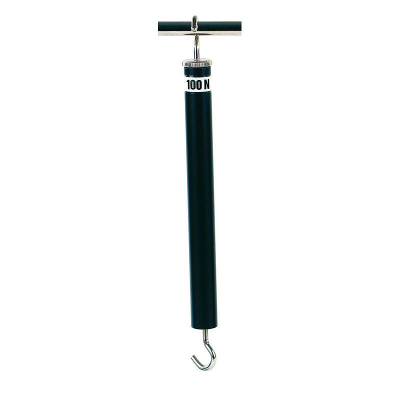 Federkraftmesser mit Newtonskala, halbseitig gelb/rote Blockskala sowie exakte Strichskala, Nullpunktkorrektur mittels Stellschraube, Sicherung gegen Überdehnung der Feder, in färbiger Metallhülse mit Aufhänge- und Lasthaken;