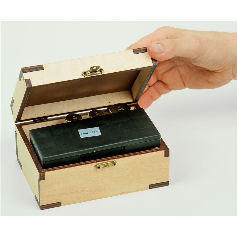 Präzisionsgewichte (Klasse „M“) in verschließbarem Aufbewahrungskasten aus Holz, mit Pinzette