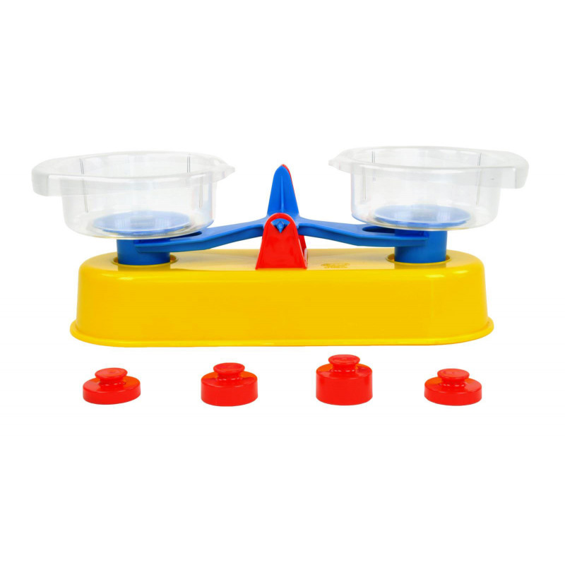Gleicharmiger Waagebalken aus Kunststoff mit angehängten Tafeln und zwei abnehmbaren, transparenten Schalen;