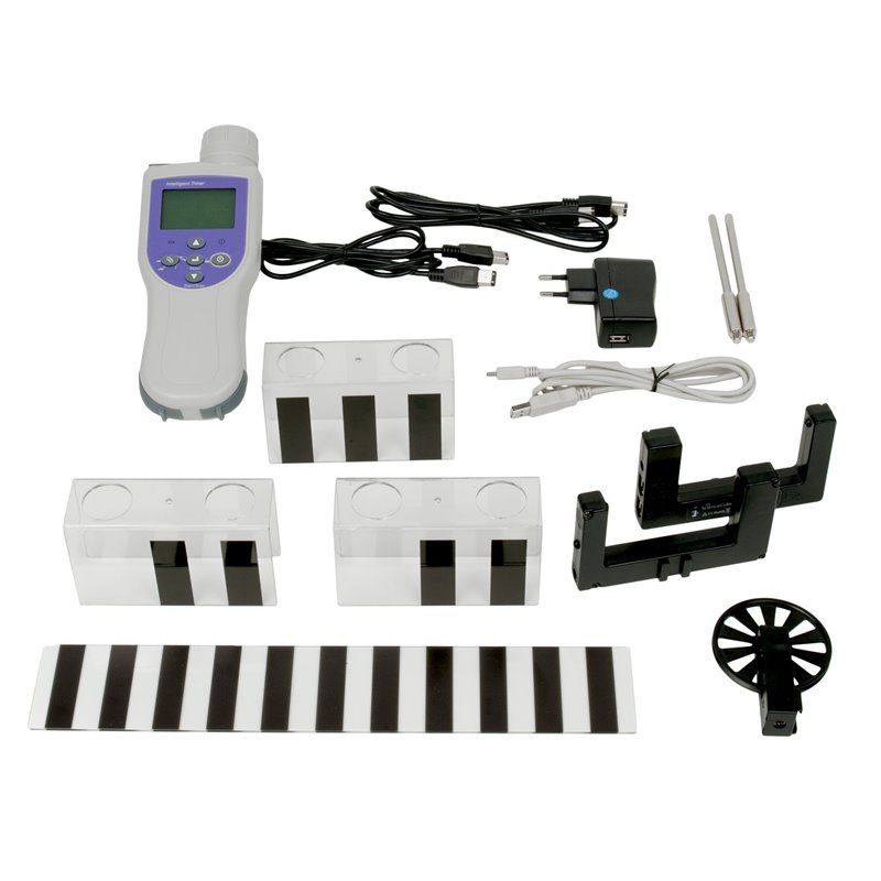 Kompakte, intelligente Zeitmesseinheit; durch die exakte 0,1 ms-Auflösung und eine einfach bedienbare Menüführung mit Speichermöglichkeiten sind Experimente zur Bewegungslehre einfach mess- und berechenbar;mit Gabellichtschranken und –Speichenrad können auch Resultate für Geschwindigkeit und Beschleunigung angezeigt werden;Zeitmodus:- eine Lichtschranke- g-Leiter (misst und speichert 11 Zeitintervalle)- zwei Lichtschranken- Speichenrad (misst und speichert 10 Unterbrechungen)- Pendelschwingung (misst 1. und 3. Unterbrechung)- StoppuhrGeschwindigkeitsmodus:- Lichtschranke – Einzelbetrieb (cm/s)- Stoßversuche (mit 1 oder 2 Wagen)- Umlenkrolle (rad/s)- Umlenkrolle (U/s)Beschleunigungsmodus:- Lichtschranke – Einzelbetrieb (cm/s²)- zwei Lichtschranken (cm/s²)- Speichenrad linear (cm/s²)- Speichenrad radial (rad/s²)Zählmodus (Ereigniszählungen):- für 30, 60, 300 Sekunden oder „manuell“Lieferumfang:1 x Zeitzähler, intelligent2 x Gabellichtschranke1 x Speichenrad für Gabellichtschranke1 x g-Leiter2 x Blende für Experimentierwagen mit 2 Balken1 x Blende für Experimentierwagen mit 3 Balken2 x Verbindungskabel (Typ 1394)1 x Steckernetzgerät 5V1 x USB Verbindungskabel2 x Stativstange für Gabellichtschranken2 MesseingängeAkku-Batterie 3,7 V/1100 mAh, Betriebsdauer: ca. 40 h (wenn vollgeladen)Abmessungen: 200 x 80 x 35 mmMasse des Zählers: ca. 265 g