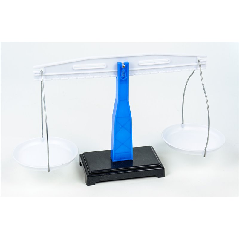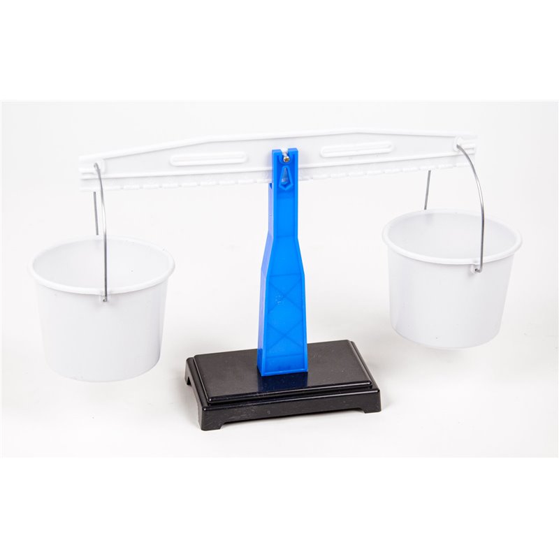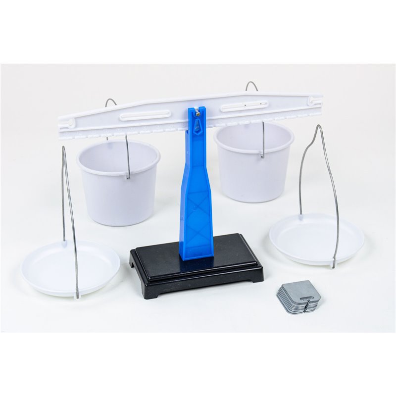Einfache und robuste Balkenwaage für Schüler, mit 2 Wiegeschalen für Feststoffe, 2 Wiegeeimer für Flüssigkeiten und 10 Hängegewichte für Hebelgesetze;