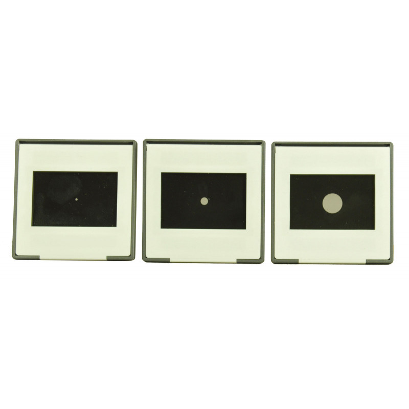 Zur Demonstration der optischen Systeme bei Fotoapparaten bzw. Lochkameras sowie beim Modell des Auges; drei Lochblenden unterschiedlichen Durchmessers, jeweils auf einem Film fotografisch hergestellt, zwischen zwei Glasplatten in Diarahmen montiert Lochdurchmesser der Blenden: 1, 3 und 8 mmAbmessungen: jeweils 50 x 50 x 3 mmMasse: ca. 24 g