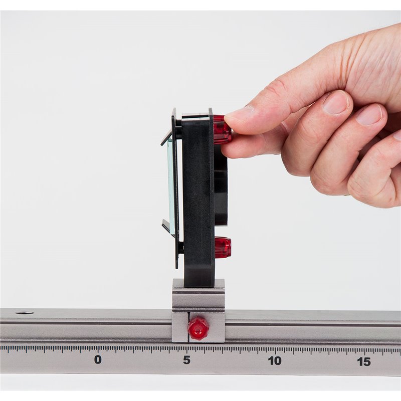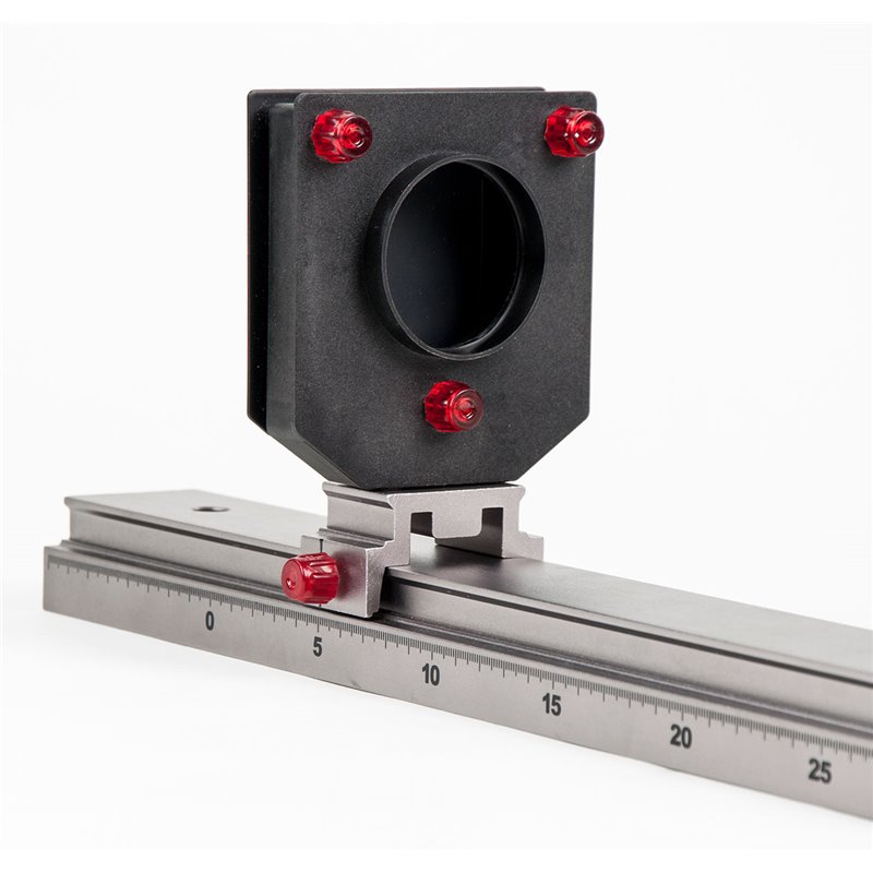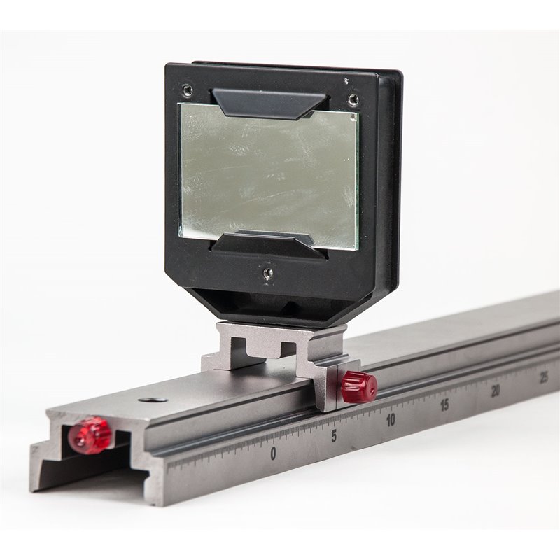 Zur gezielten und fein einstellbaren Ablenkung von reflektierten Lichtbündeln; planer Glasspiegel auf Metallplatte, neigbar durch drei Schrauben an der Rückseite, montiert auf Optik-Halter SE Höhe der optischen Achse: 58 mmSpiegelfläche: 75 x 50 mmAbmessungen des Halters: 90 x 39 x 98 mmMasse: ca. 140 g