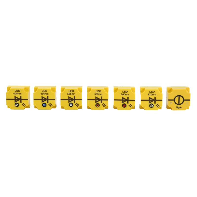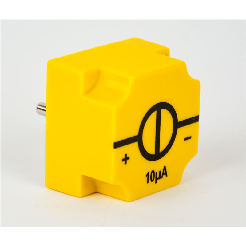 Zum Schutz der Dioden bei der Bestimmung der Planck'schen Konstante "h" mit LEDs (innerer Photoeffekt); Steckbaustein für NTL Schülerversuche (STB) Konstantstromregler 10 µA; robustes Kunststoffgehäuse mit transparenter Bodenplatte, der Bauteil ist daher gut sichtbar und ebenso vor mechanischen Schäden geschützt, die Bodenplatte ist mit Kreuzschlitzschrauben festgeschraubt, kaputte Bauteile können daher sehr rasch und einfach repariert bzw. ersetzt werden, siebbedruckte Leitungen und Schaltsymbole schaffen ein eindeutig erkennbares Schaltschema eines Versuchsaufbaus, robuste 4-mm Steckerstifte ermöglichen eine sichere elektische Steckverbindung mit den Metallplättchen der SteckplatteBodenplatte mit zwei SteckerstiftenAbstand der Steckerstifte: 19 mmType: KonstantstromreglerMaterial (Oberteil): Kunststoff ABS, gelbMaterial (Steckerstifte): Messing, vernickeltAbmessungen: 40 x 40 x 27(41) mmMasse: 21 gzur Durchführung des Versuches werden noch mehrere LEDs mit verschiedenen Wellenlängen benötigt, besser jedoch ist die Verwendung des gesamten Gerätesets P9901-PK Planck'scher Gerätesatz "STB"