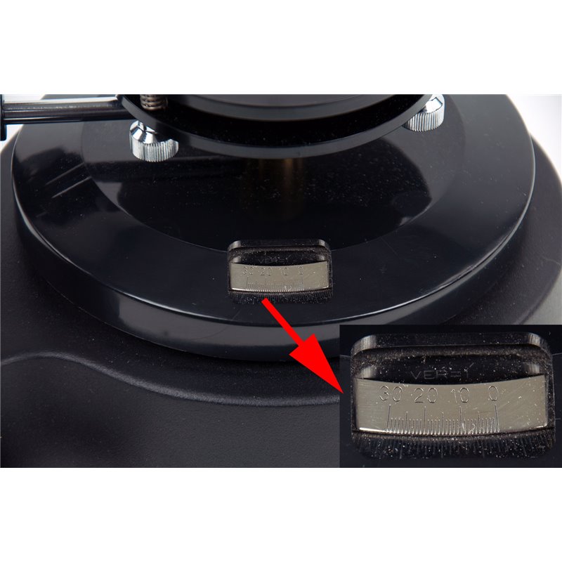 Um den Tisch schwenkbares Beobachtungsfernrohr, mit Feintrieb zur Einstellung der Brennweite.