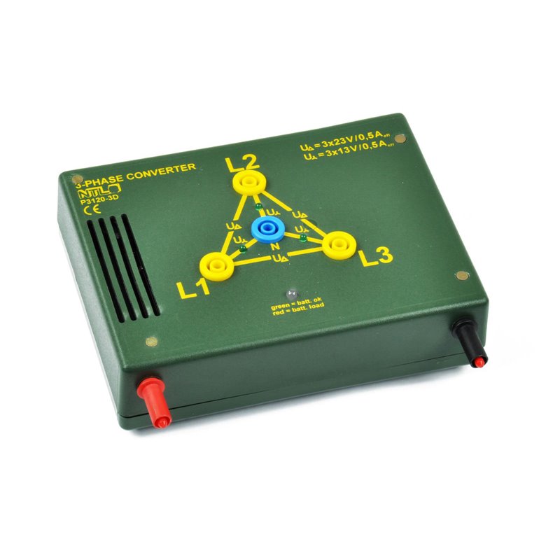 Hauptanwendung dieses Gerätes ist in Verbindung mit dem Akku "inno" oder dem Festspannungstrafo "inno" die Stromversorgung zur Durchführung von Experimenten mit Drehstrom. Es ermöglicht alle wesentlichen Drehstromversuche zur Schulphysik, auch wenn im Experimentiersaal kein Drehstrom- oder auch kein Netzanschluss vorhanden ist. Dieses Netzgerät ist magnethaftend, daher kann es an Metalltafeln an die passende Stelle eines Stromkreises geheftet werden. Der Versuchsaufbau ist daher absolut übersichtlich.Der Konverter (Drehstromtrafo) liefert je drei Wechselspannungen in Stern- bzw. Dreieckschaltung mit einer Frequenz von 70 Hz. Die Spannungen betragen 13 bzw. 23 V und sind in ihrer Phase um 120 bzw. 240 Grad verschoben.TECHNISCHE DATEN:Ausgang: Vier 4-mm-Sicherheitsbuchsen, dauerkurzschlussfest, in Dreieckschaltung 3 x 23 Veff, 500 mA, 70 Hz und in Sternschaltung 3 x 13 Veff, 500 mA, 70 Hz3 x 3-mm-LEDs zur Kontrolle der AusgangsspannungStromversorgung: 6 ... 15 V DC, stabilisiert, mind. 5 AGehäuse: Kunststoff, ABSAbmessungen: ca. 160 x 120(143) x 45 mmMasse: ca. 550 gEmpfehlenswerte Stromversorgung:P3120-1B Akku "inno" 6 V/10 AhoderP3120-1N Festspannungstrafo "inno"