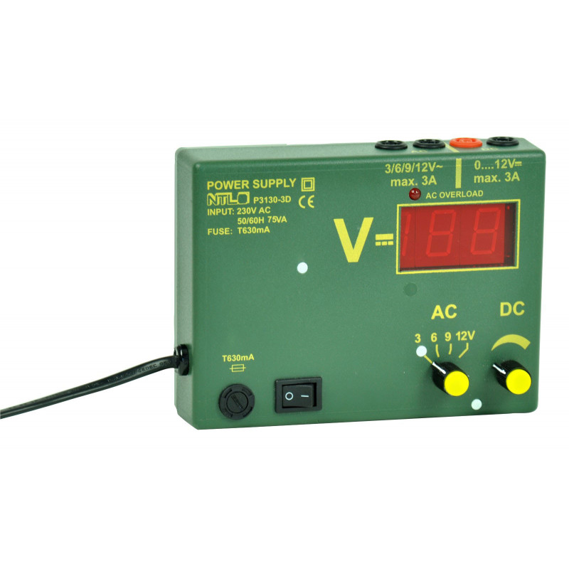 Stromversorgung für sämtliche Schülerexperimente der NTL - Literatur, sowie für die meisten Versuche zur Elektrik und Elektronik in Demo-Versuchen. Das Netzgerät liefert eine in vier Stufen einstellbare Wechselspannung als auch eine stufenlos einstellbare, elektronisch stabilisierte Gleichspannung. Durch die handliche Größe und einen elektronischen Überlastschutz ist dieses Netzteil ideal für Schülerversuche geeignet.Technische Daten:Ausgänge: 0 … 12 V DC stufenlos einstellbar, stabilisiert, max. 3A3 / 6 / 9 / 12 V AC fest einstellbar, max. 3 AAusgänge: Galvanische Trennung vom Netz (= RiSU - konform)Digitalanzeige für den DC-Ausgang: 2 ½stellige LED-7 Segmentanzeige, superhellZiffernhöhe: 20 mmalle Ausgangsspannungen an 4-mm-Sicherheitsbuchsen entnehmbar Ein/Aus- SchalterLED signalisiert Überlastung oder KurzschlussPrimär-Schmelzsicherung: T 630 mAAnschlussspannung: 230 V AC / 50...60 HzGehäuse: Kunststoff ABSAbmessungen: ca. 160 x 120 x 45(60) mmMasse: ca. 1100 g