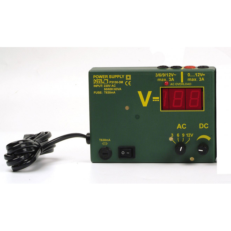 Stromversorgung für die meisten Versuche zur Elektrik und Elektronik der NTL - Literatur. Das Netzgerät liefert eine in vier Stufen einstellbare Wechselspannung als auch eine stufenlos einstellbare, elektronisch stabilisierte Gleichspannung. Durch die handliche Größe und einen elektronischen Überlastschutz ist dieses Netzteil ideal für das Experimentieren geeignet. Dieses Netzgerät ist magnethaftend, daher kann es an Metalltafeln an die passende Stelle eines Stromkreises geheftet werden. Der Versuchsaufbau ist daher absolut übersichtlich.Technische Daten:Ausgänge: 0 … 12 V DC stufenlos einstellbar, stabilisiert, max. 3A3 / 6 / 9 / 12 V AC fest einstellbar, max. 3 AAusgänge: Galvanische Trennung vom Netz (= RiSU - konform)Digitalanzeige für den DC-Ausgang: 2 ½stellige LED-7 Segmentanzeige, superhellZiffernhöhe: 20 mmalle Ausgangsspannungen an 4-mm-Sicherheitsbuchsen entnehmbar Ein/Aus- SchalterLED signalisiert Überlastung oder KurzschlussPrimär-Schmelzsicherung: T 630 mAAnschlussspannung: 230 V AC / 50...60 HzGehäuse: Kunststoff ABSAbmessungen: ca. 160 x 120 x 45(60) mmMasse: ca. 1120 g