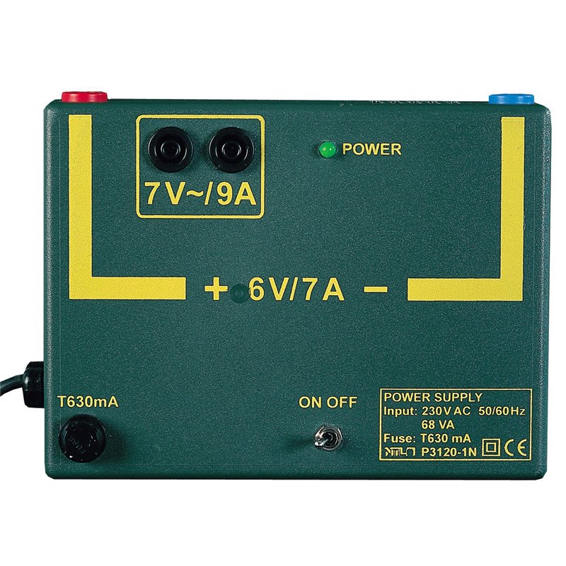 Netzbetriebene Stromversorgung für den Einsatz mit dem DC-Konverter "inno", dem AC-Konverter "inno", dem Funktionsgenerator "inno", dem Drehstromkonverter "inno" sowie für Hochstromversuche mit dem Konstantstromregulator "inno", das Gehäuse ist magnethaftend und eignet sich daher besonders für alle Magnethaftversuche aus dem NTL-inno-SYSTEM;Technische Daten:Ausgangsspannungen: 6 V DC, stabilisiert, max. 7 Asowie 7 V AC, max. 9 AAusgänge: kurzschlussfest und elektronisch überlastgeschütztSpannungsausgang: zwei 4-mm SicherheitsbuchsenAnschlussspannung: 230 V AC / 50...60 HzGehäuse: Kunststoff ABSAbmessungen: ca. 160x120x45(50) mmMasse: ca. 1220 g
