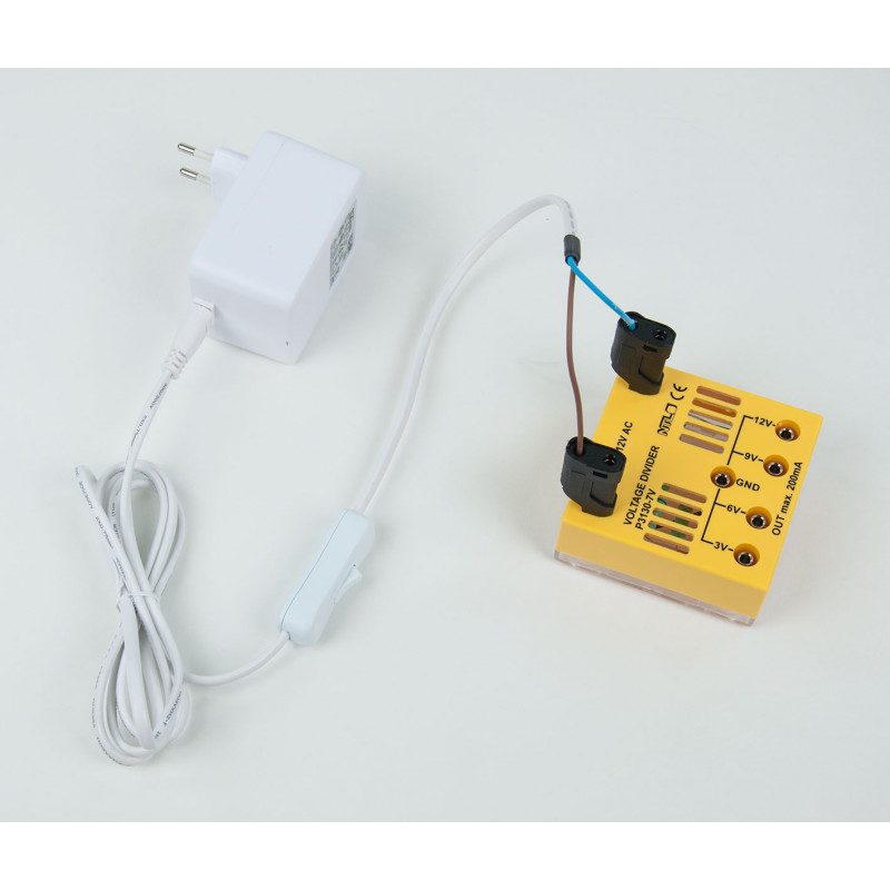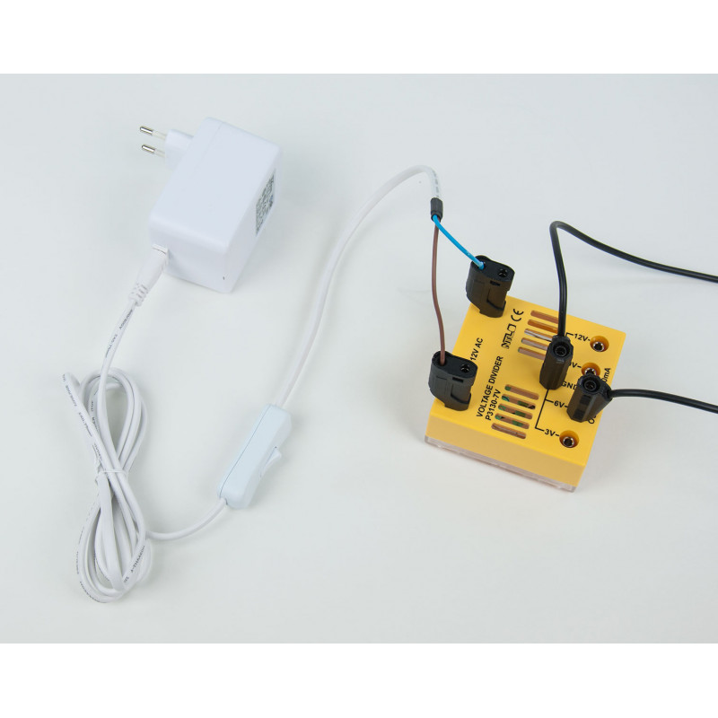 Für Versuche mit Wechselspannung (Trafoversuche); teilt eine Fixspannung von 12 V in vier wählbare Teilspannungen; Technische Daten:Eingang: 12 V ACAusgänge: 3, 6, 9 oder 12 V ACalle Ausgänge durch PTCs einzeln kurschlussgeschütztNennlast: 100 OhmAusgangsstrom: max. 200 mABuchsen auch für 4-mm-Sicherheitsstecker geeignetKunststoffgehäuse mit transparenter BodenplatteAbmessungen: 84 x 84 x 39 mmMasse: ca. 92 g