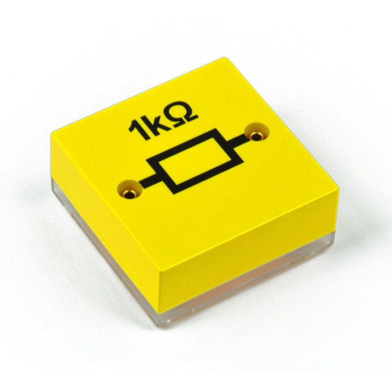 Magnetbaustein compact - System (MBC), Baustein Widerstand 1 kOhm; robustes Kunststoffgehäuse (ABS) mit transparenter Bodenplatte, der Bauteil ist daher gut sichtbar, jedoch ebenso vor mechanischen Schäden geschütztSchaltsymbol aufgedruckt (Siebdruck) zwei Buchsen, auch für 4-mm Sicherheitsstecker geeignetBodenplatte abnehmbar, mit inliegenden Neodymium MagnetenWiderstandswert: 1000 OhmToleranz: 5 %Leistung: 2 WAbmessungen: 84 x 84 x 39 mmMasse: 68 g