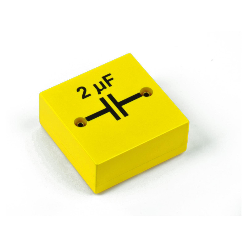 Magnetbaustein compact - System (MBC), Baustein Kondensator 2 µF; robustes Kunststoffgehäuse (ABS) mit transparenter Bodenplatte, der Bauteil ist daher gut sichtbar, jedoch ebenso vor mechanischen Schäden geschütztSchaltsymbol aufgedruckt (Siebdruck) zwei Buchsen, auch für 4-mm Sicherheitsstecker geeignetBodenplatte abnehmbar, mit inliegenden Neodymium MagnetenKapazität: 2 µFSpannung: 100 VAbmessungen: 84 x 84 x 39 mmMasse: 76 g