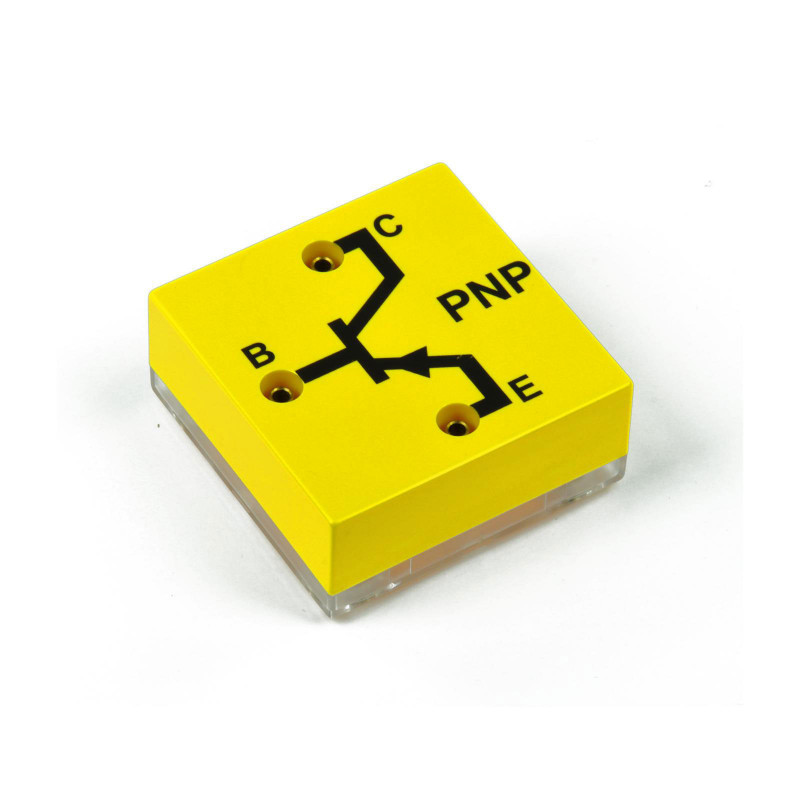 Magnetbaustein compact - System (MBC), Baustein Transistor PNP Basis links; robustes Kunststoffgehäuse (ABS) mit transparenter Bodenplatte, der Bauteil ist daher gut sichtbar, jedoch ebenso vor mechanischen Schäden geschütztSchaltsymbol aufgedruckt (Siebdruck) zwei Buchsen, auch für 4-mm Sicherheitsstecker geeignetBodenplatte abnehmbar, mit inliegenden Neodymium MagnetenTransistortype: BD140Basis: linksAbmessungen: 84 x 84 x 39 mmMasse: 80 g