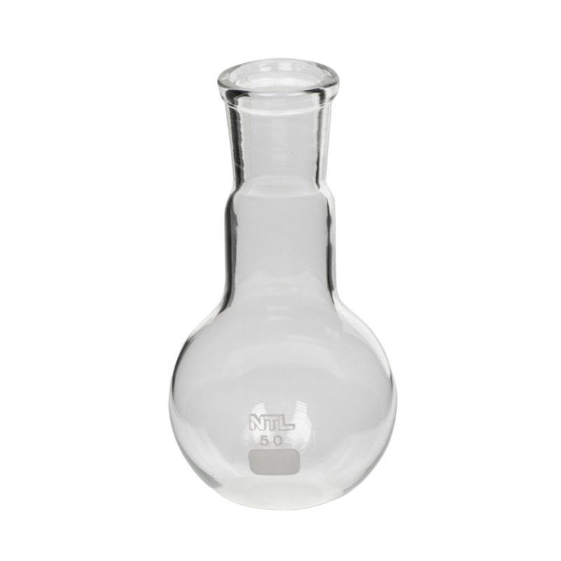 Rundkolben aus Borosilikatglas, dickwandig, schwer schmelzbarStopfenbett SB 19Füllvolumen: 50 mlAbmessungen: D=51 mm, H=100 mmMasse: ca. 37 g