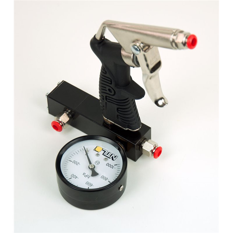 Rückschlagventil in Metallgehäuse, Manometer, Pistole zur dosierten Gaszufuhr,
