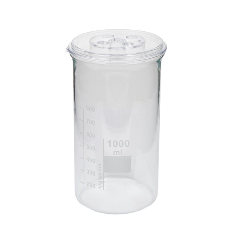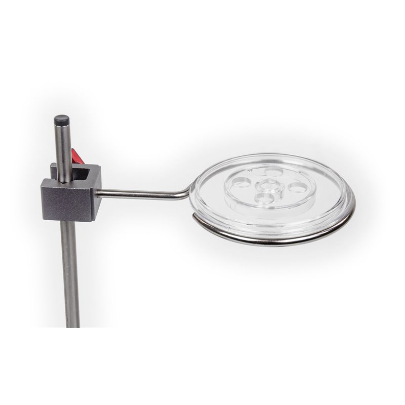 Zur einfachen und raschen Halterung von Stabelektroden, Stäben für Wärmeleitung, Thermometern, Thermofühlern oder sonstiger stabförmiger Sensoren; transparenter Deckel aus Kunststoff, zum Auflegen auf Bechergläser (Do=60 – 103 mm), auf das Isoliergefäß P2700-3D oder auf den Stativring D=102 mm, Stäbe oder Thermometer mit einem D von 6 – 8 mm können mittels Silikonstopfen 10/14/20 mm mit Loch (C7320-1B) gehaltert werden4 x Loch-D=12,5 mm1 x Loch-D=13,5 mm1 x Loch-D= 3,3 mmAbmessungen: D=107 mm, H=11 mmMasse: ca. 30 g