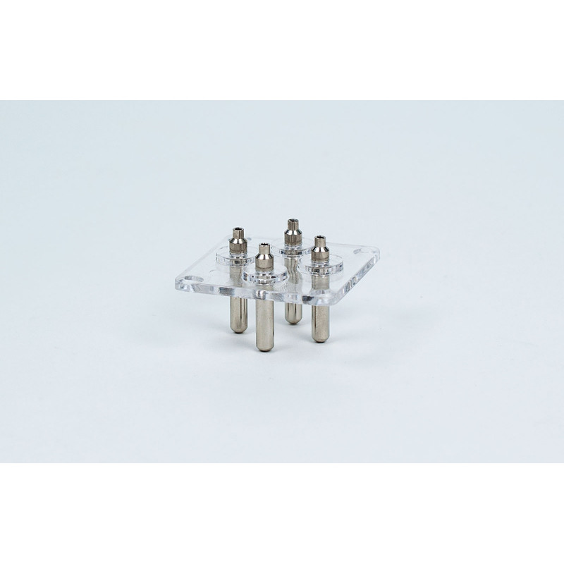 transparente Kunststoffplatte, vier eingebettete, vernickelte 4-mm Messingstifte mit Lötkelch